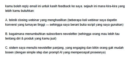 lead → sesuai dengan yang sudah saya email beberapa hari lalu, poin B adalah produk selanjutnya, idenya adalah bagaimana saya maintain newsletter saya untuk bikin orang pengen tau lebih tentang produk yang saya jual